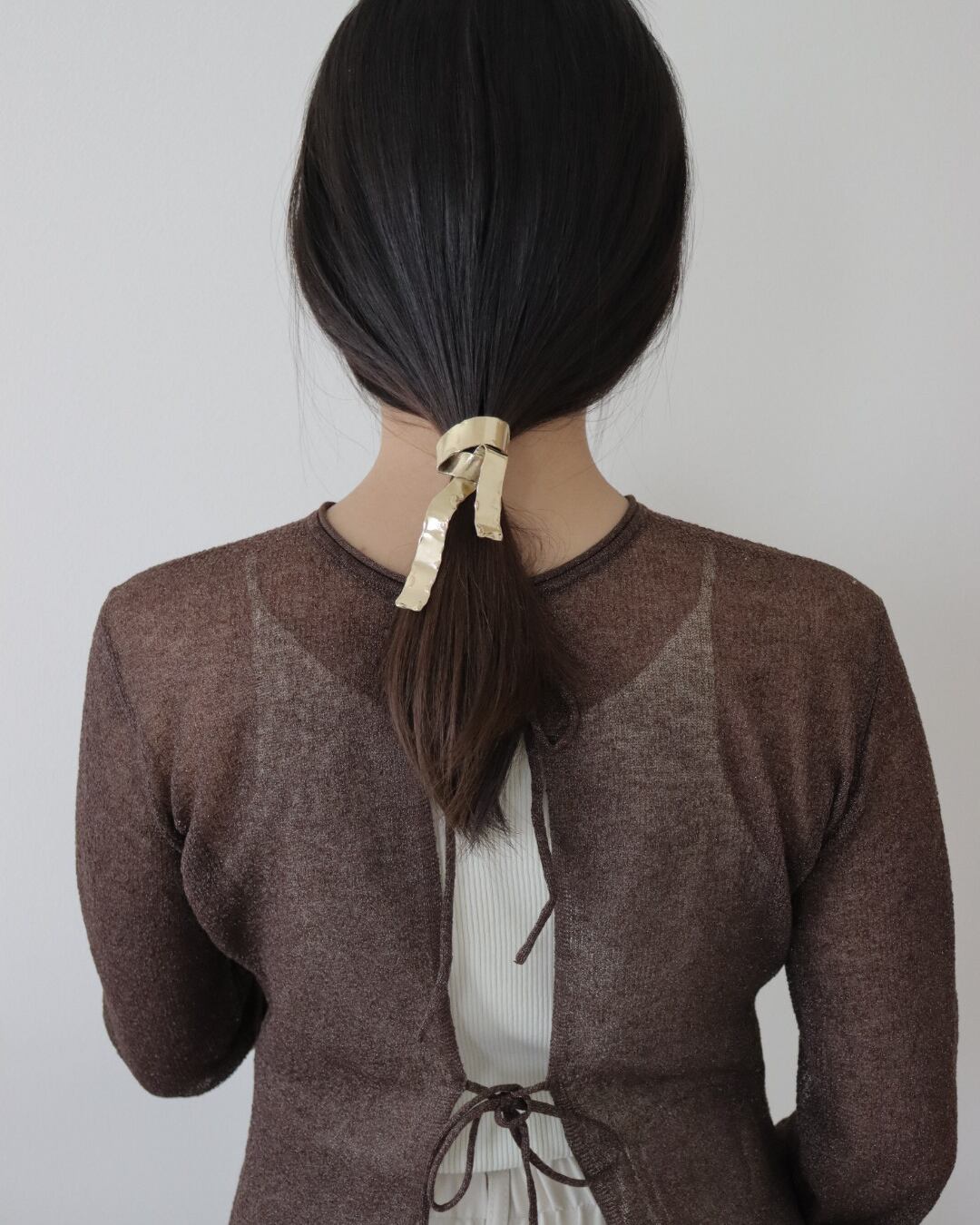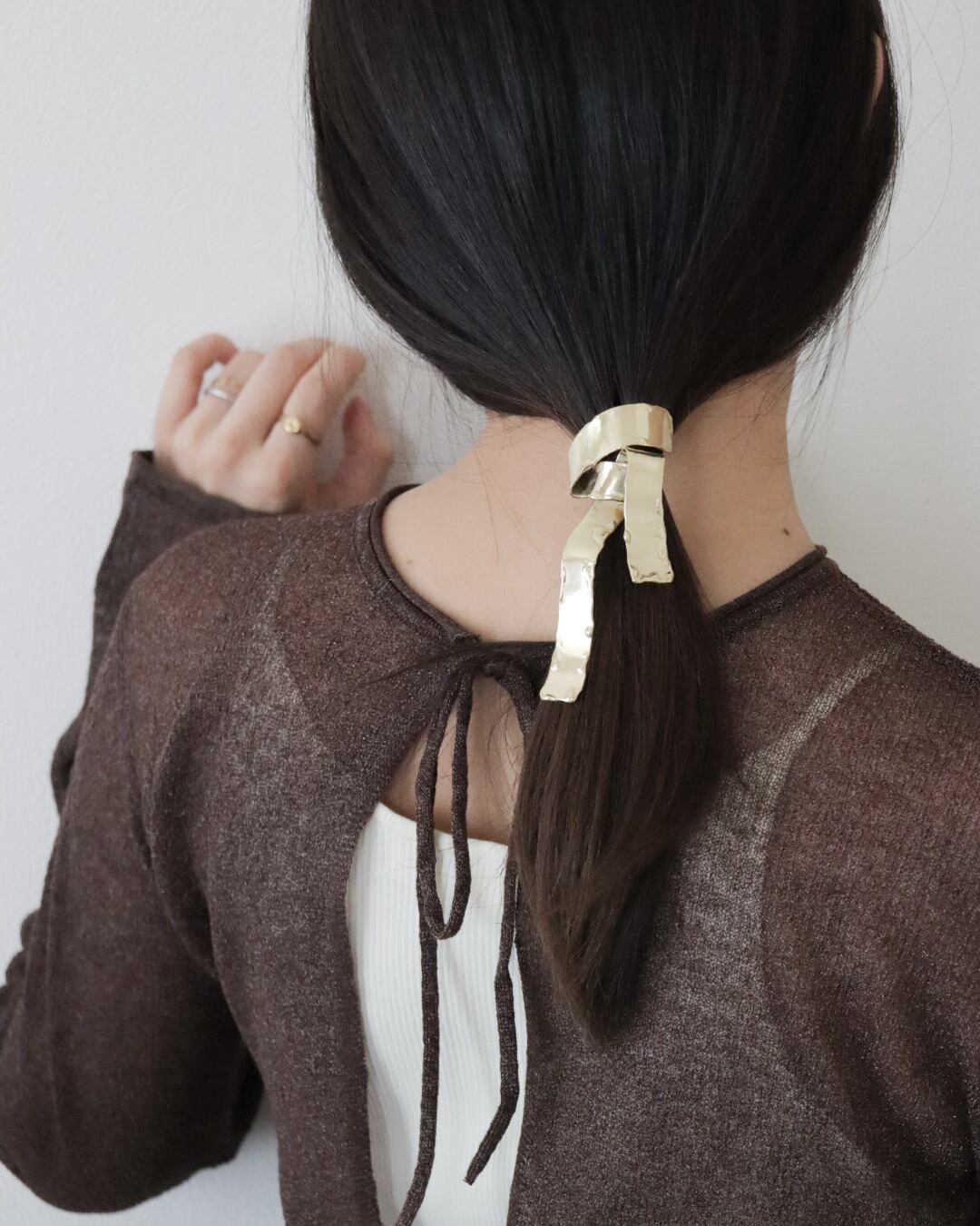 結んでいないリボンが引っかかったような甘くなりすぎないデザインにいたしました。