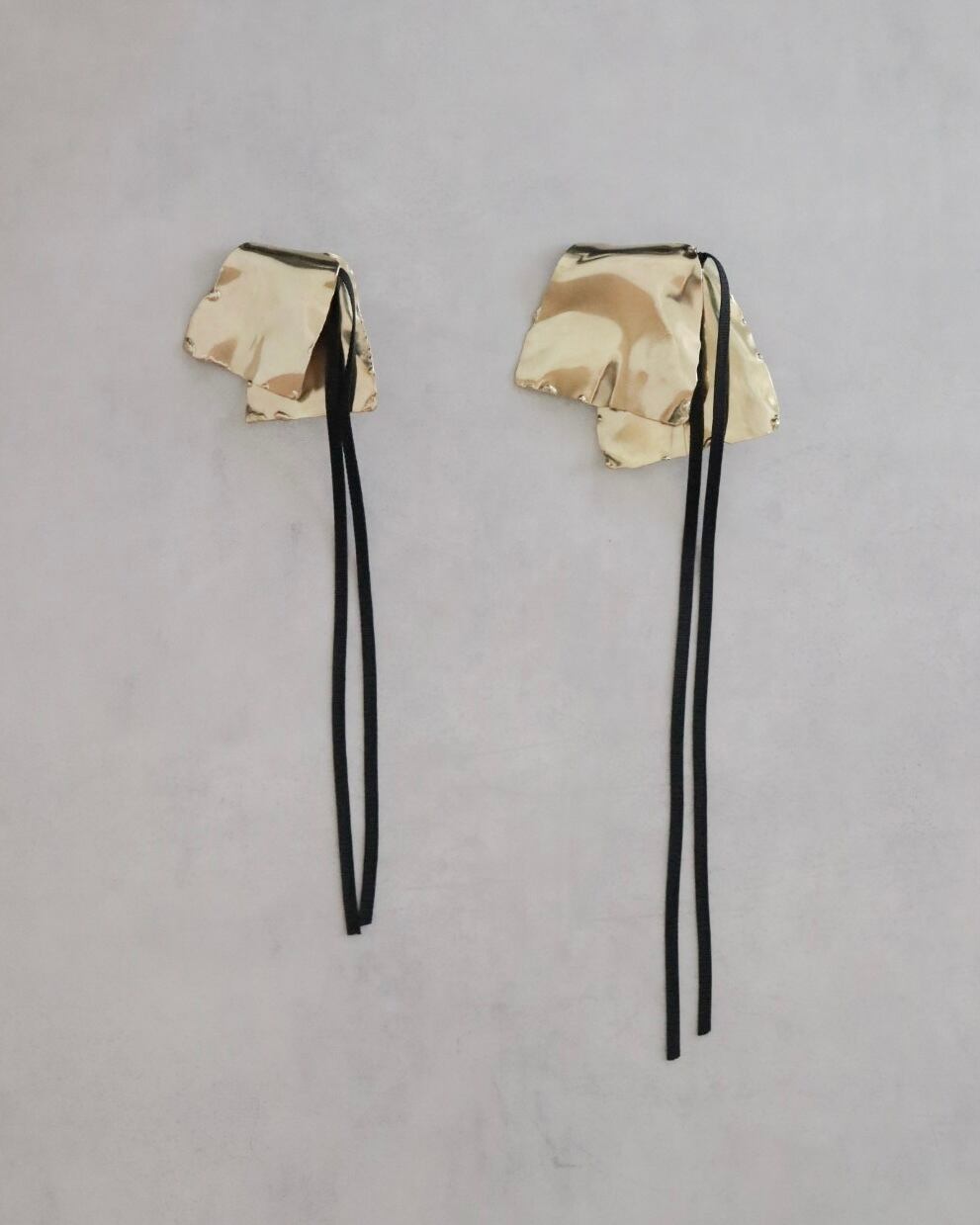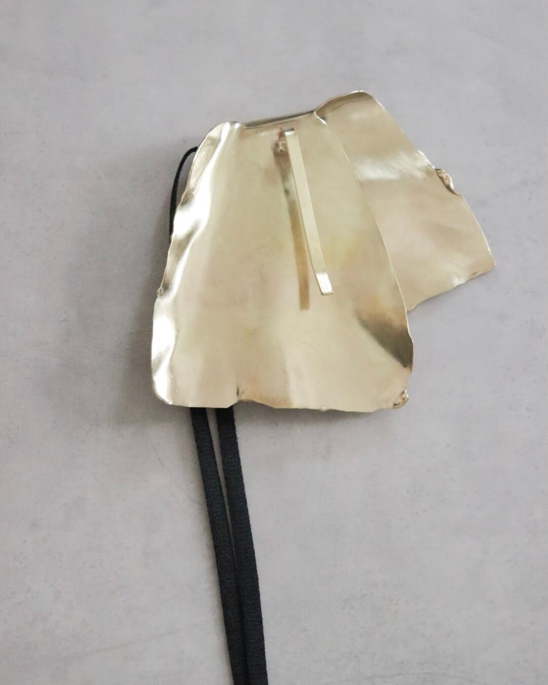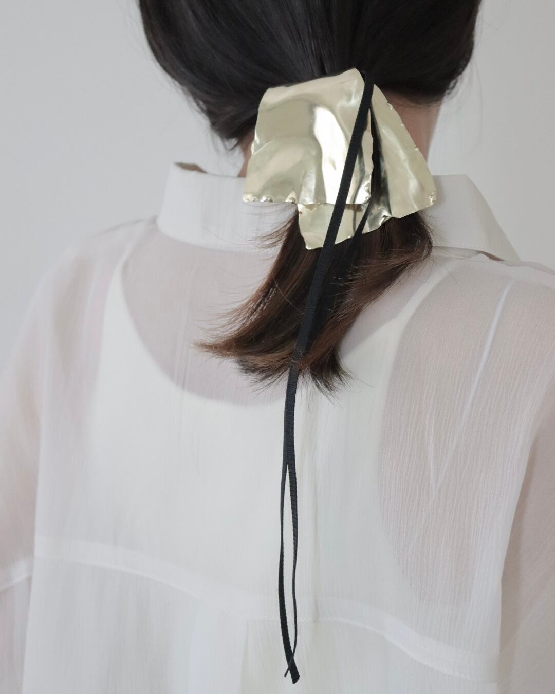 布を折り重ねたようなやわらかな表情を、金属で大胆に表現したヘアアクセサリー。