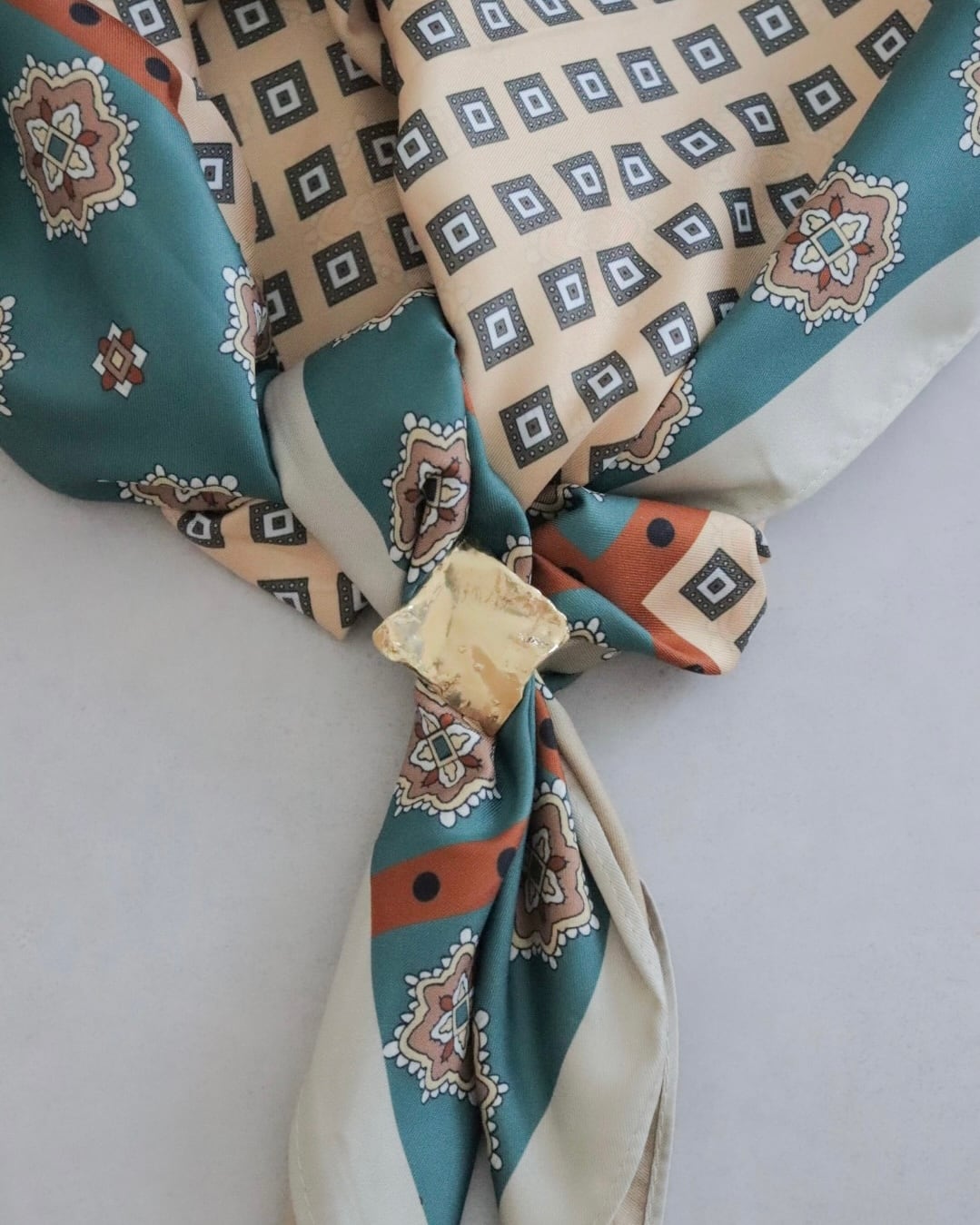 スカーフを三角に折り、端をパーツに差し込み、