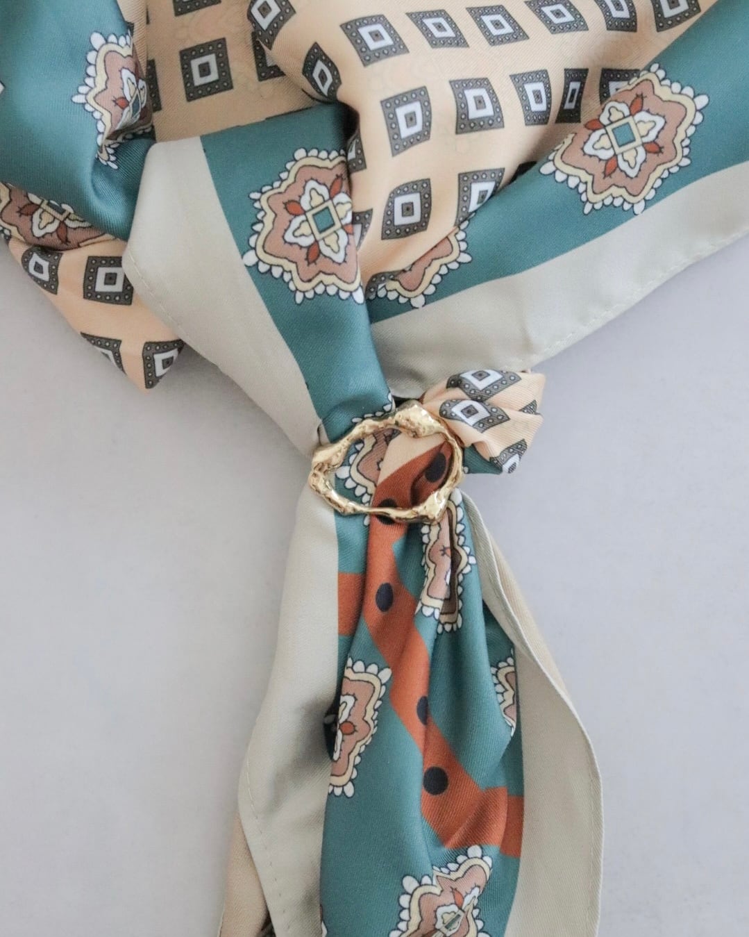 スカーフが長い場合や、腰巻きなどしっかり留めたい時は、